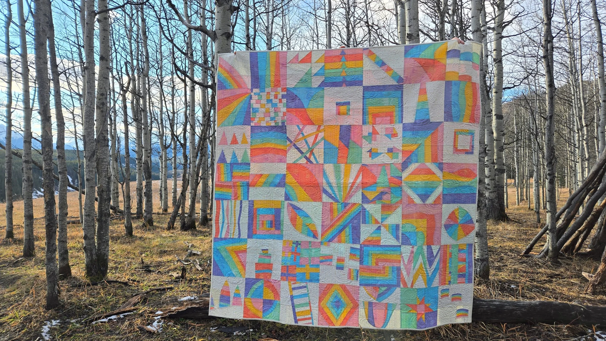This is one of the versions of the Quilters’ Playcation Adventure Sewalong quilts I made with you last year. One block for 49 weeks of the year. All improv, all play. She is such a happy rainbow! The other one remains a quilt top, but I have plans for her this winter.